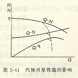 若離心泵在發(fā)生汽蝕時(shí)繼續(xù)運(yùn)轉(zhuǎn),由于氣泡的存在,會(huì)導(dǎo)致離心泵流量下降,同時(shí),泵的揚(yáng)程、救率也急劇降低,破壞正常操作。圖2—41的實(shí)線為泵正常工作時(shí)的性能曲線,虛線部分為發(fā)生汽蝕